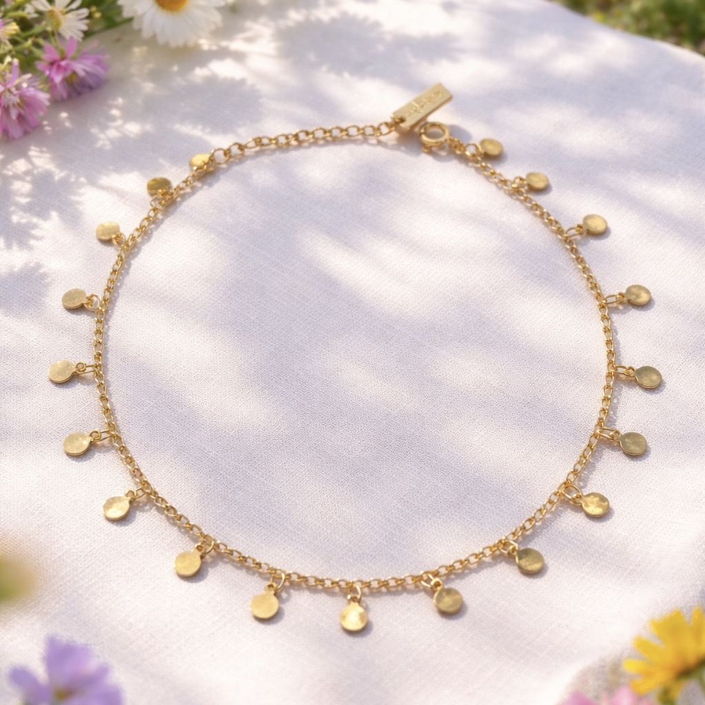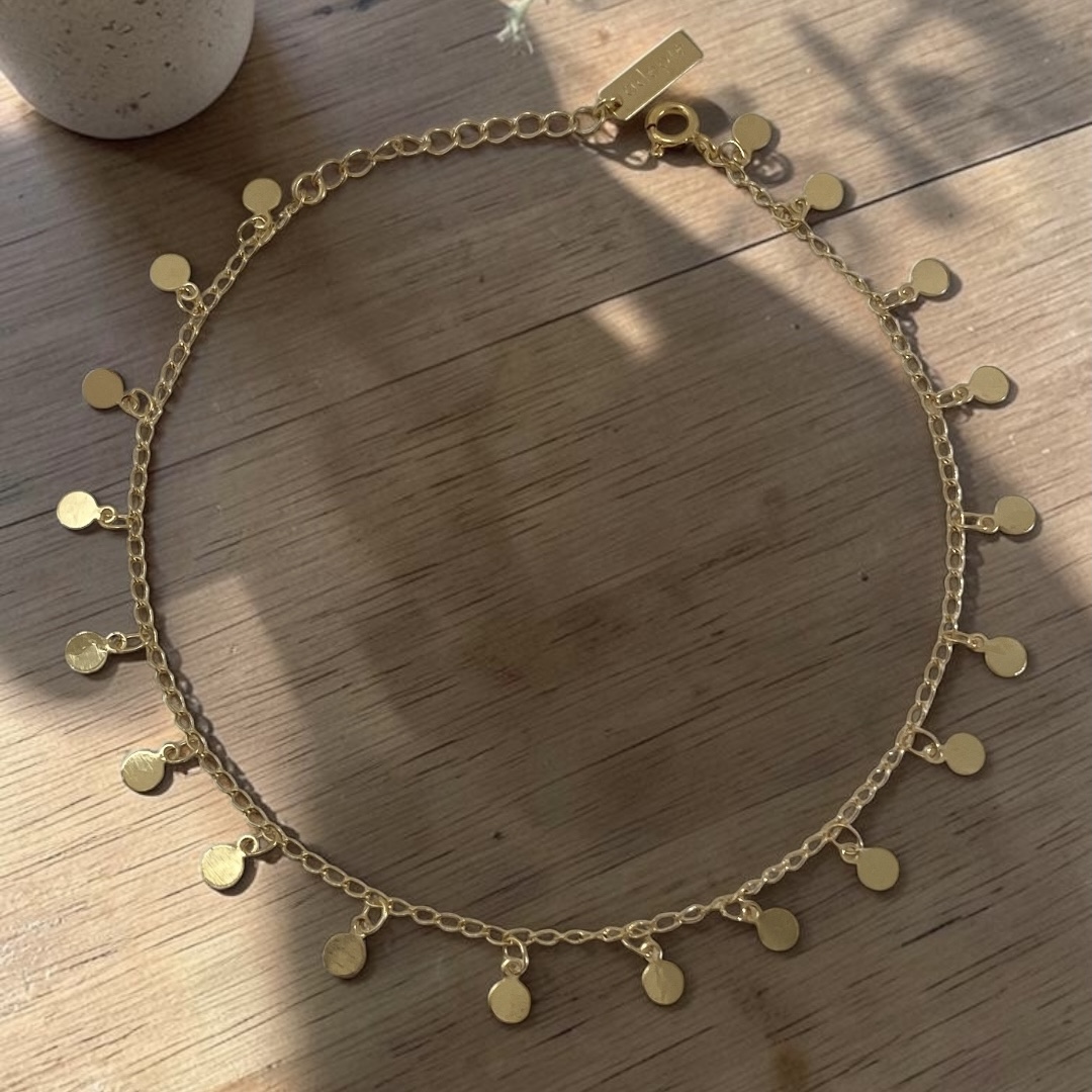 Chaîne de cheville Bahia composée d'une chaîne dorée à l'or fin ornée de petites pampilles rondes.