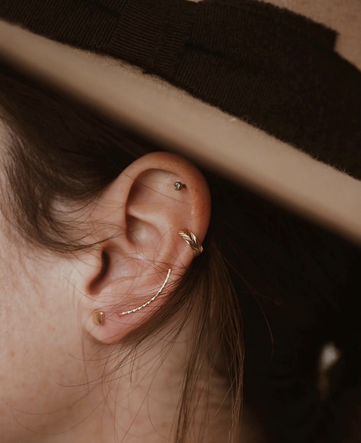 Cette boucle d'oreille délicate habille tout le lobe mais ne nécessite qu'un seul trou !