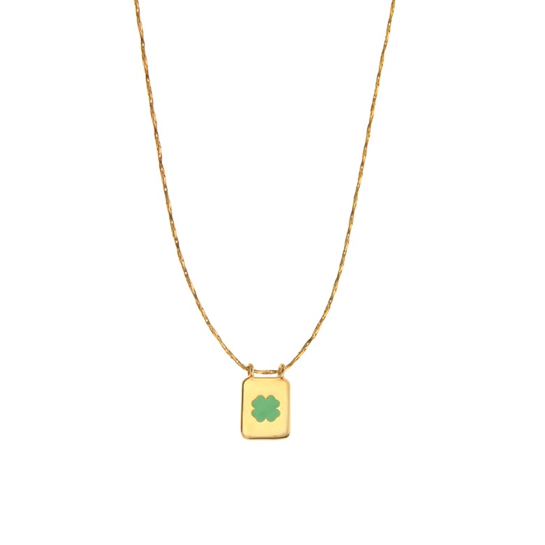 Collier composé d'une chaîne fine avec une plaque dorée ornée d'un trèfle à quatre feuilles.