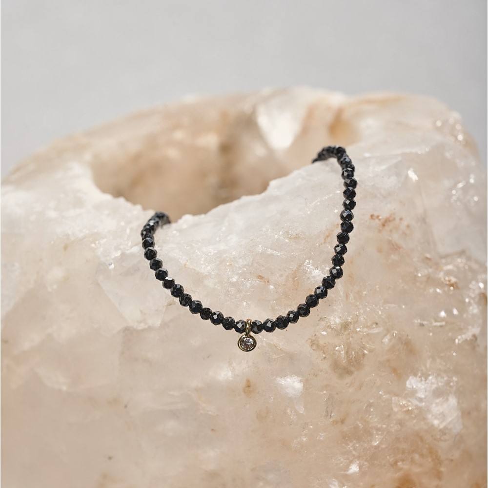 Le collier Dina se compose d’un petit pendentif serti d'un cristal et de perles en spinelle noire.