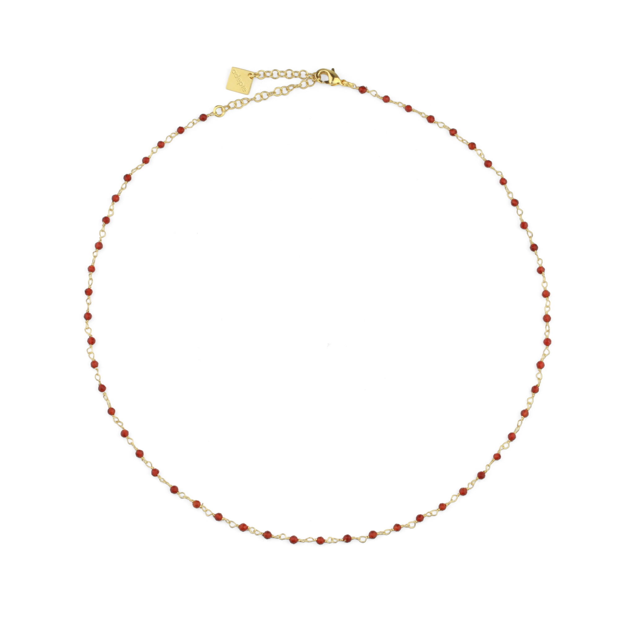 La chaîne, fabriquée artisanalement est composée d’un fil doré à l’or fin et de pierres fines. Le collier est ajustable.