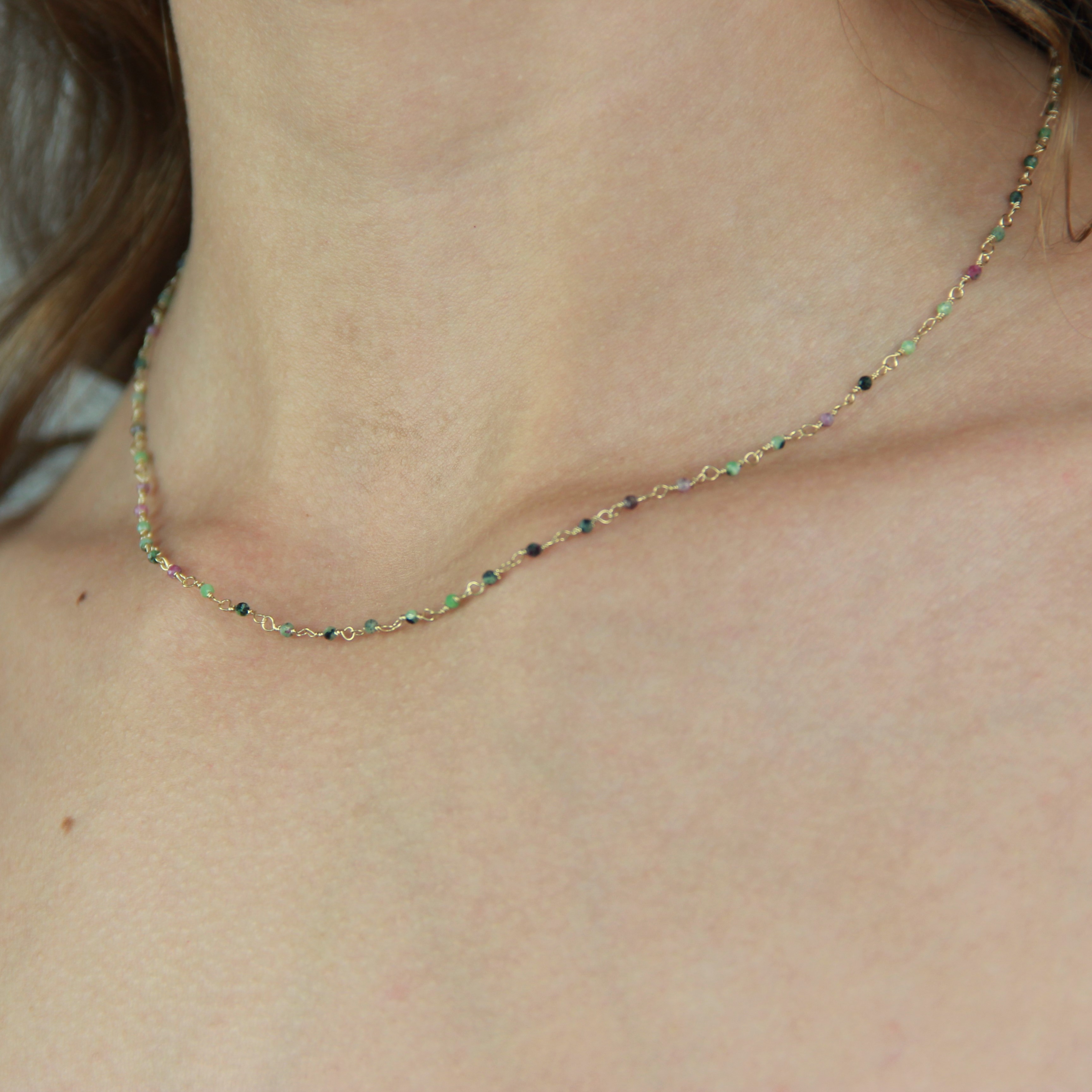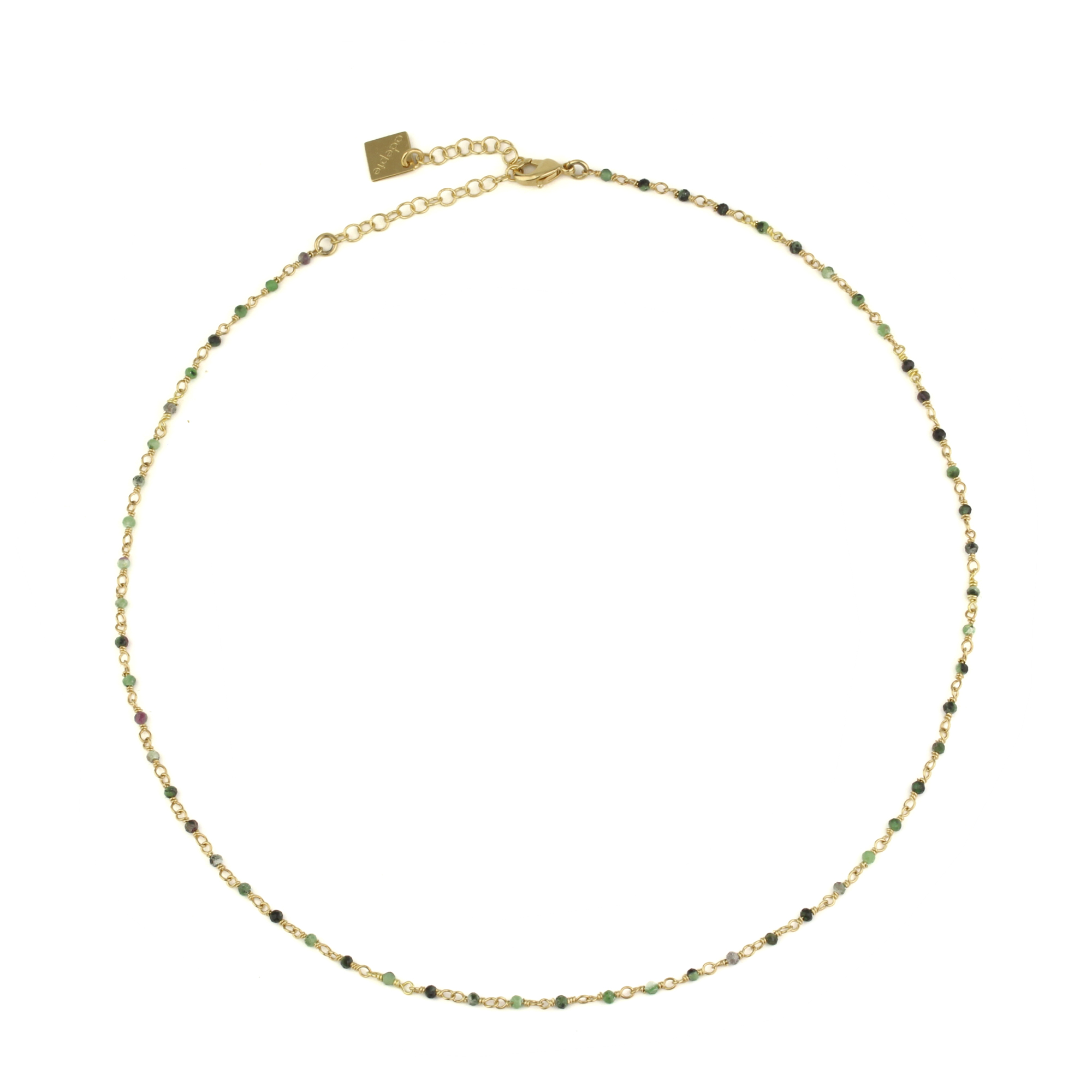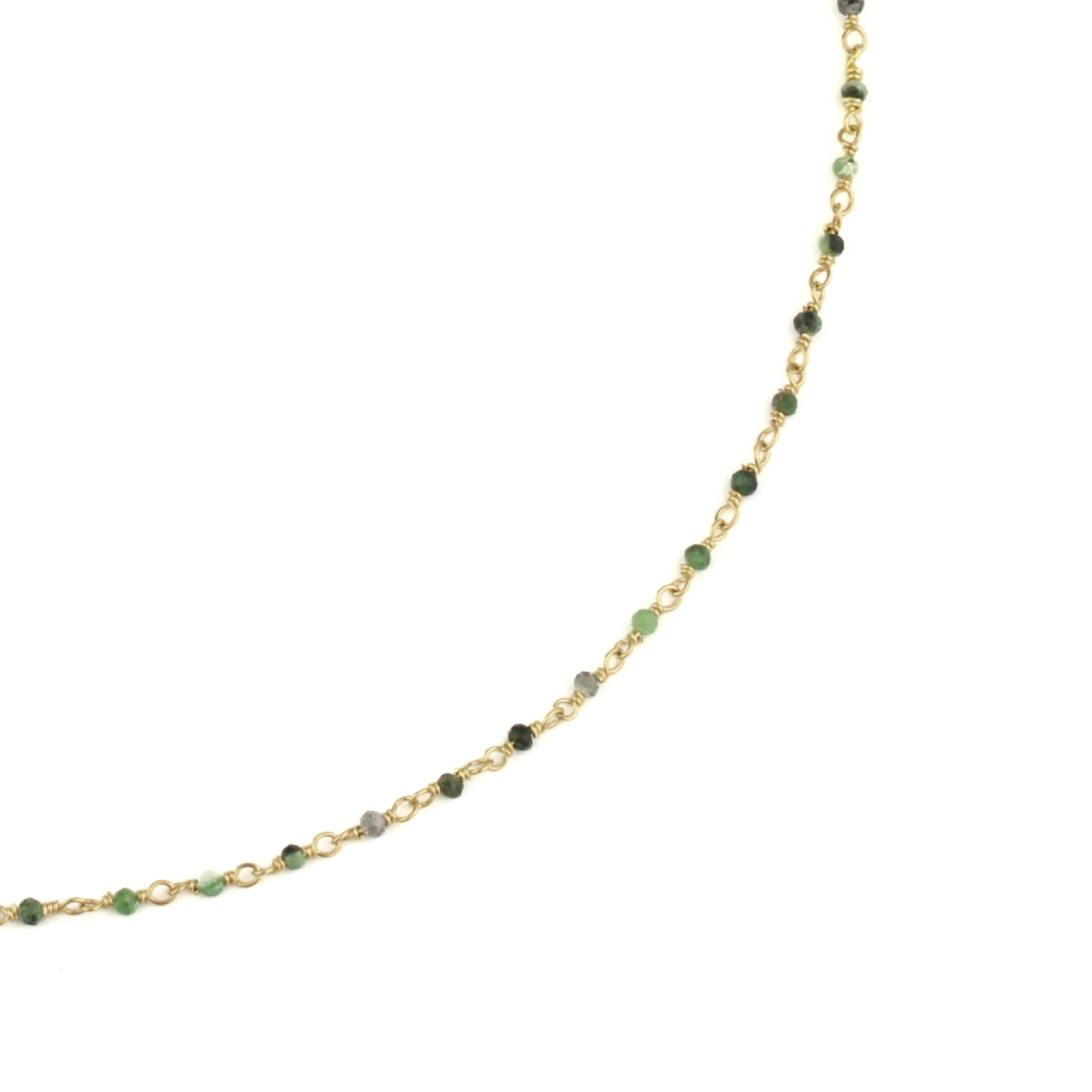 La chaîne, fabriquée artisanalement est composée d’un fil doré à l’or fin et de pierres fines. Le collier est ajustable.