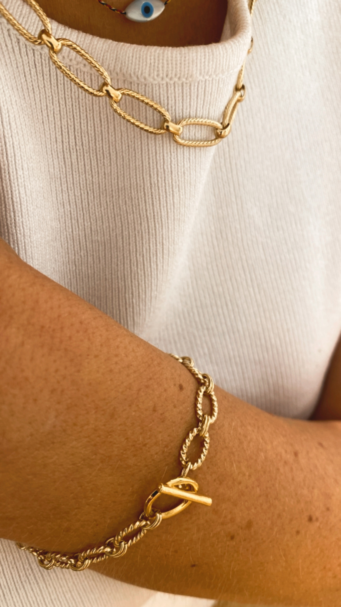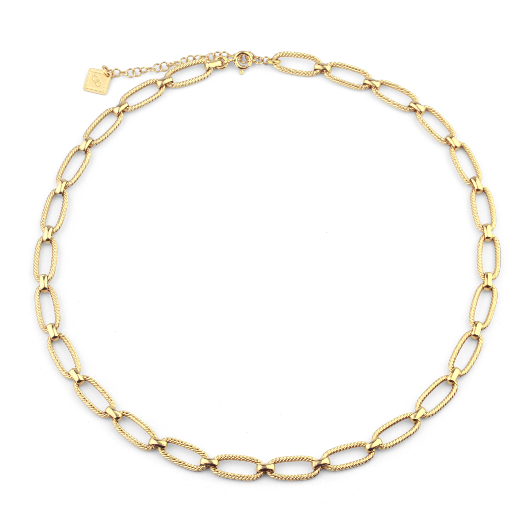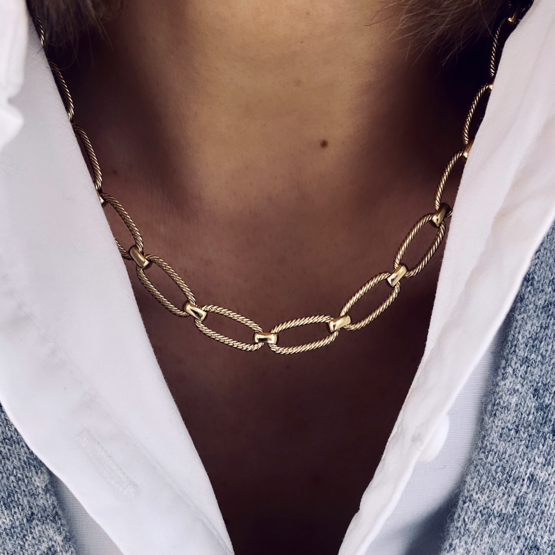 Le collier est composé de larges maillons avec un motif torsadé reliés les uns aux autes par des attaches plates et lisses.