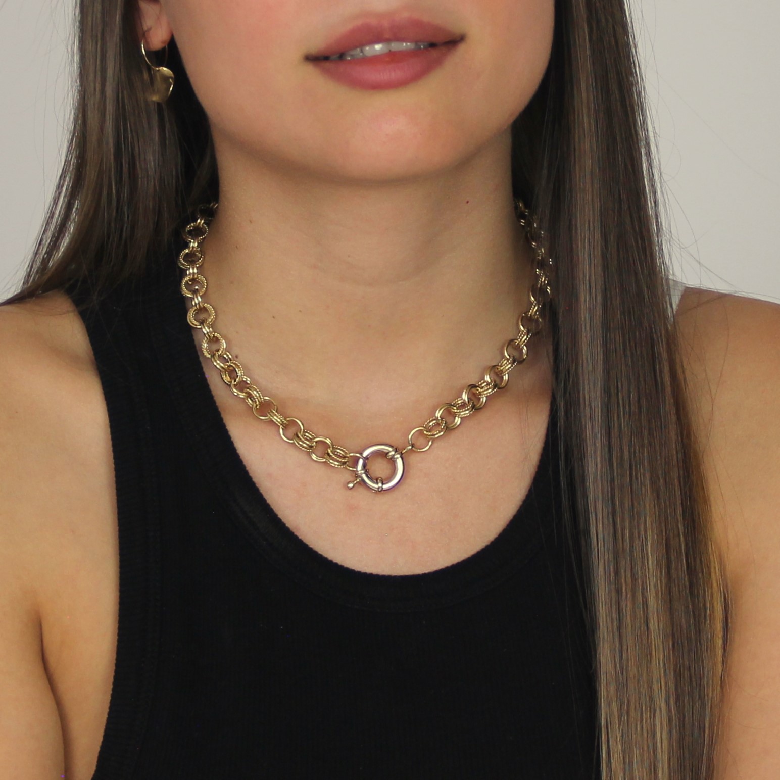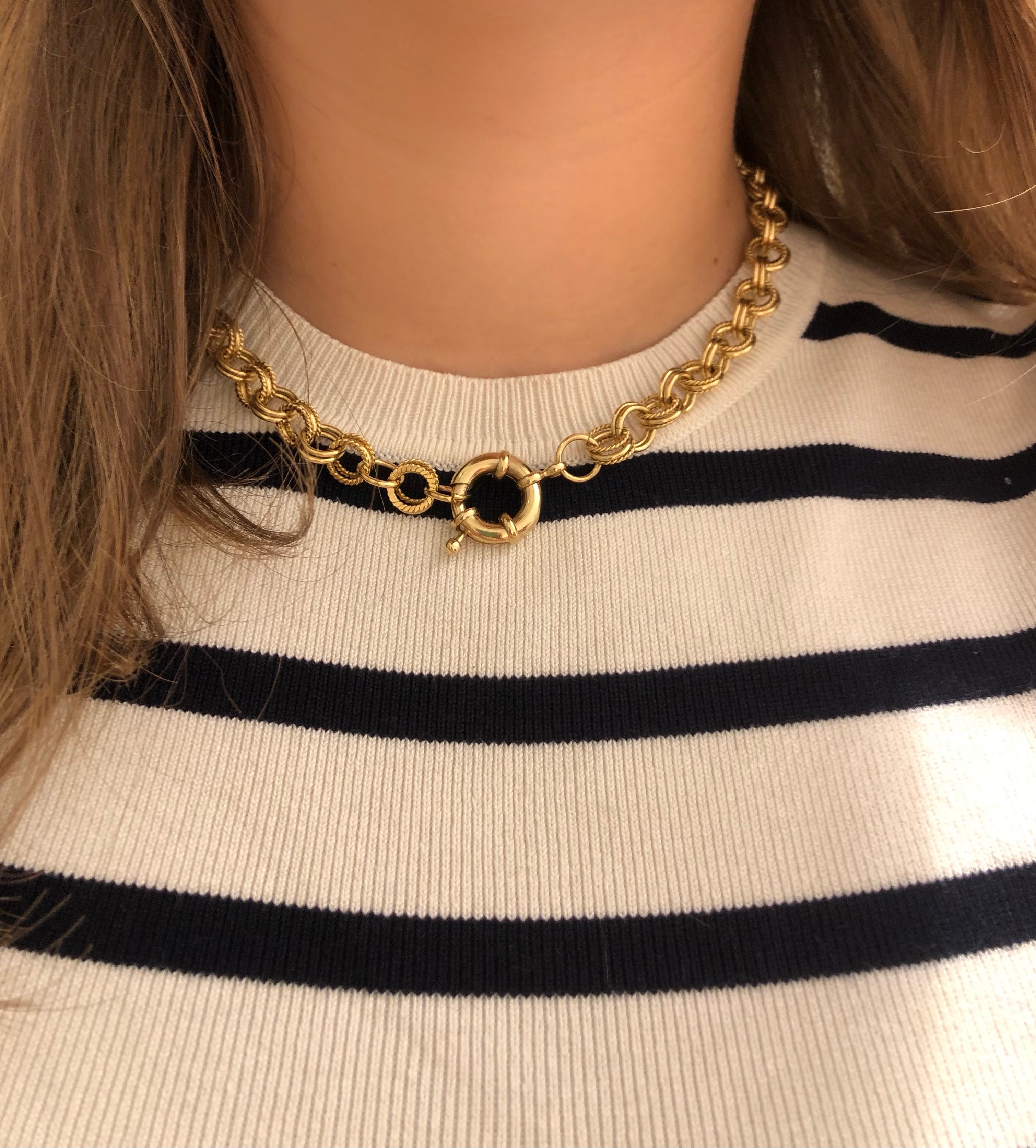Le collier Mona est composé d'une chaîne ou s'intercallent des anneaux lisses et texturés.
