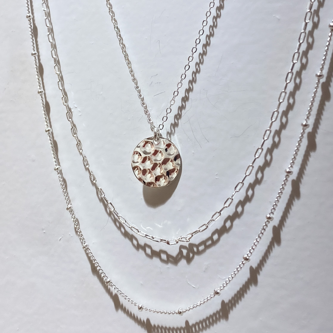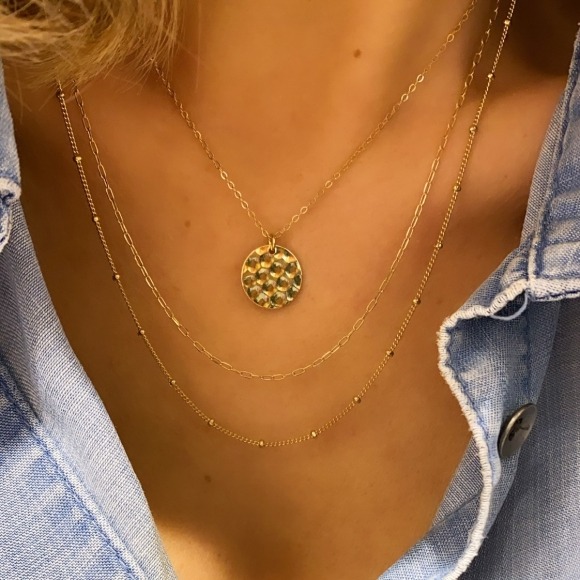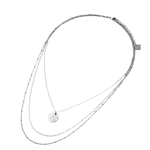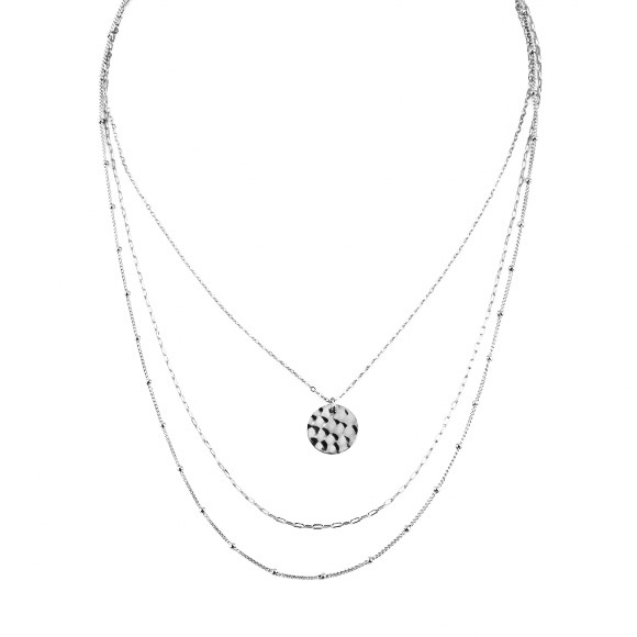 Collier composé de trois chaînes plaquées argent. Une première chaîne avec une médaille martelée. Deux autre chaînes fines, dont une avec des petites perles dorées.