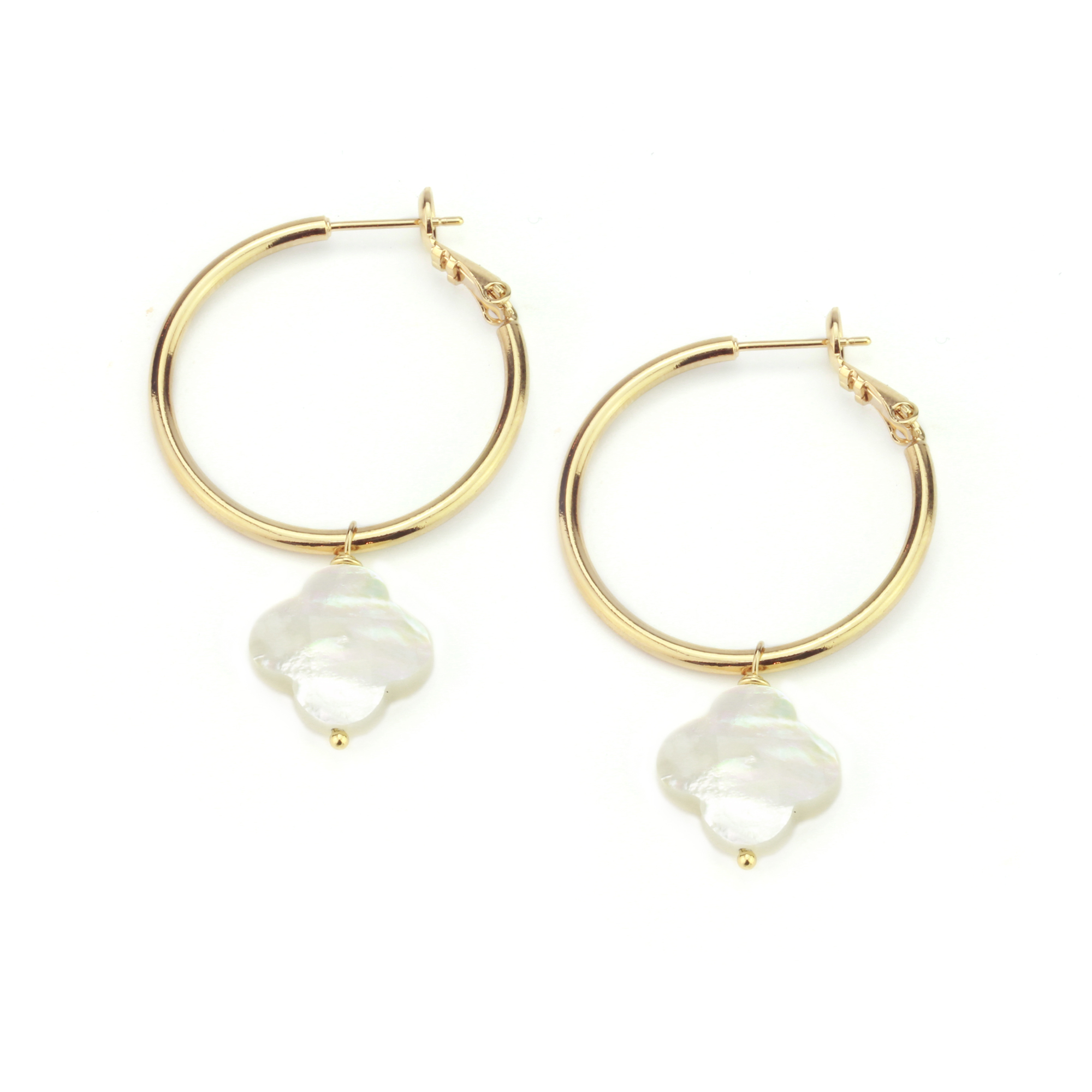 Les grandes boucles d'oreilles Clover sont composées d'un anneau et d'un pendentif en nacre blanche en forme de trèfle.