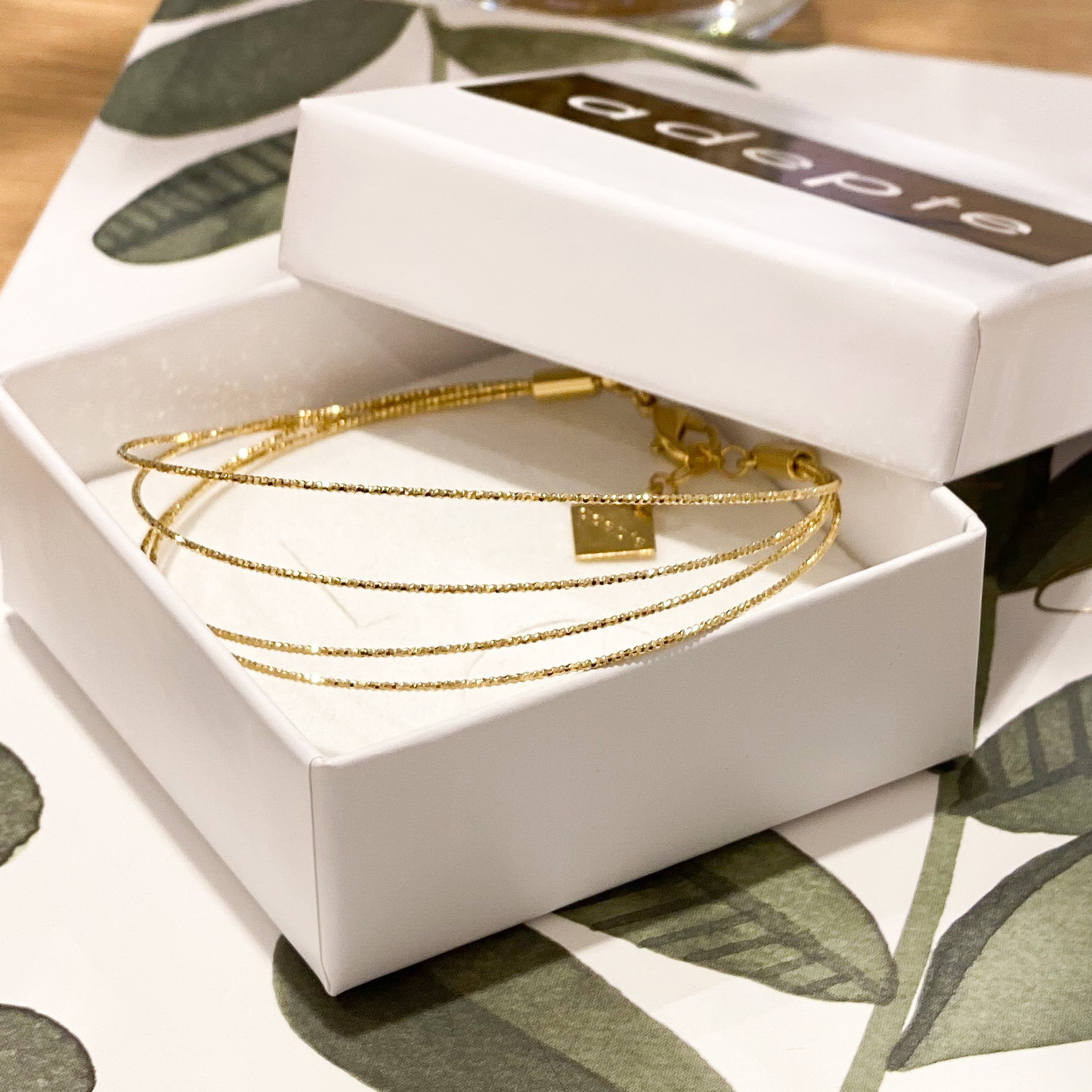Les bijoux Adepte sont dorés à l’or fin, la dorure est garantie un an. Les bijoux Adepte ne doivent pas être mis en contact avec l’eau ou tout autre produit abrasif qui pourraient altérer la dorure ou le tissage.