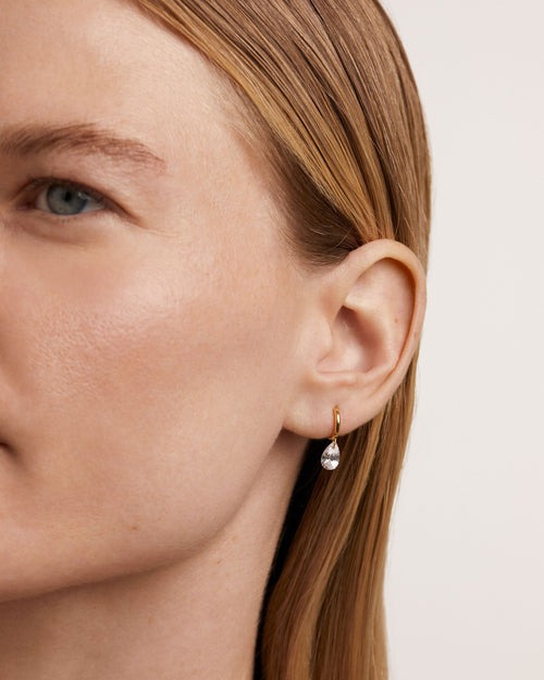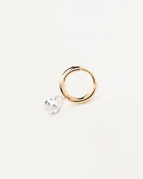 La boucle d'oreille à cerceau unique aqua est plaquée en or 18 carats et fabriquée en argent 925 avec une motivation de goutte en zircone taillée blanche.