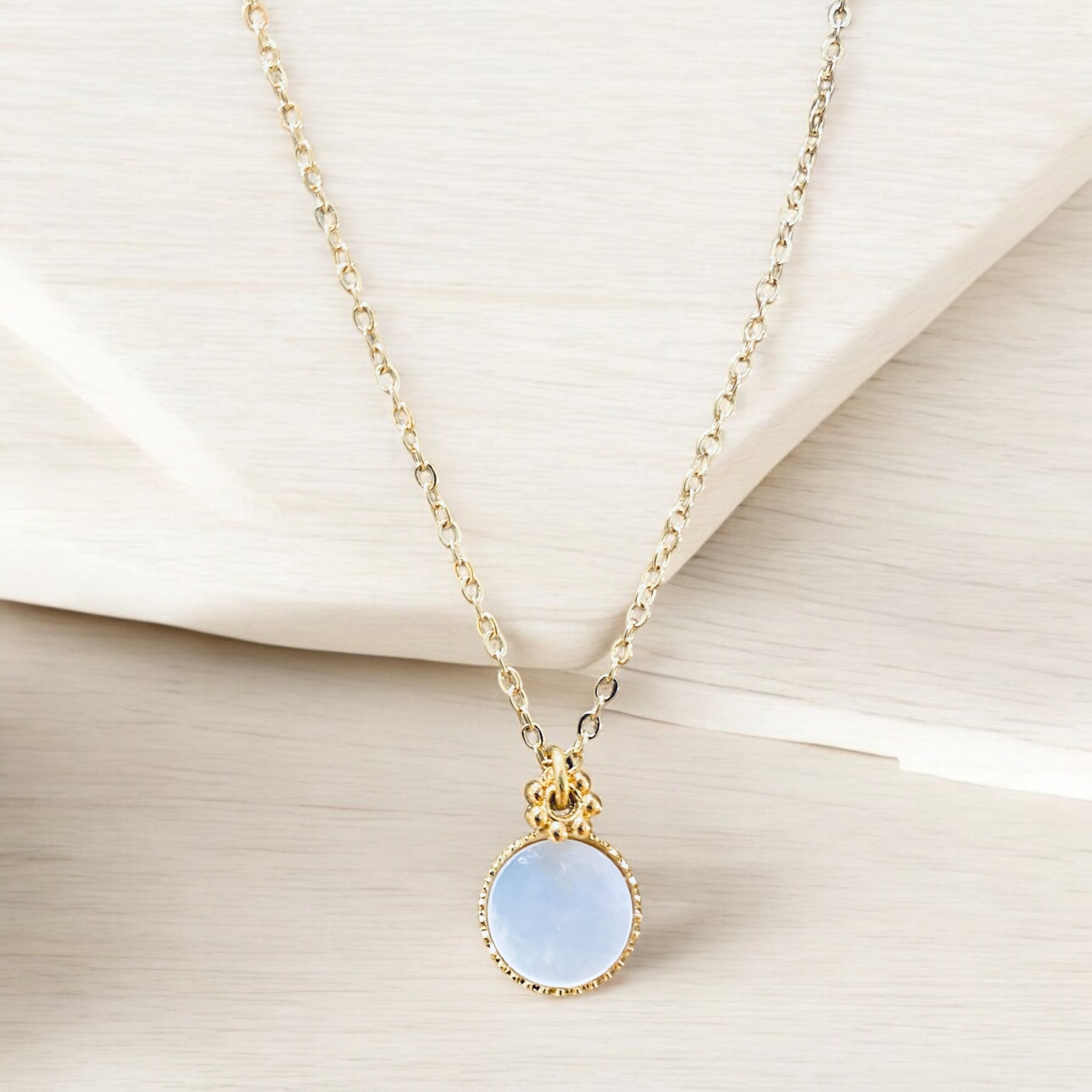 Le collier Anita est composé d'une chaîne dorée à l'or fin, d'un pendentif avec une pierre fine ronde et d'une mini intercalaire en forme de fleur.