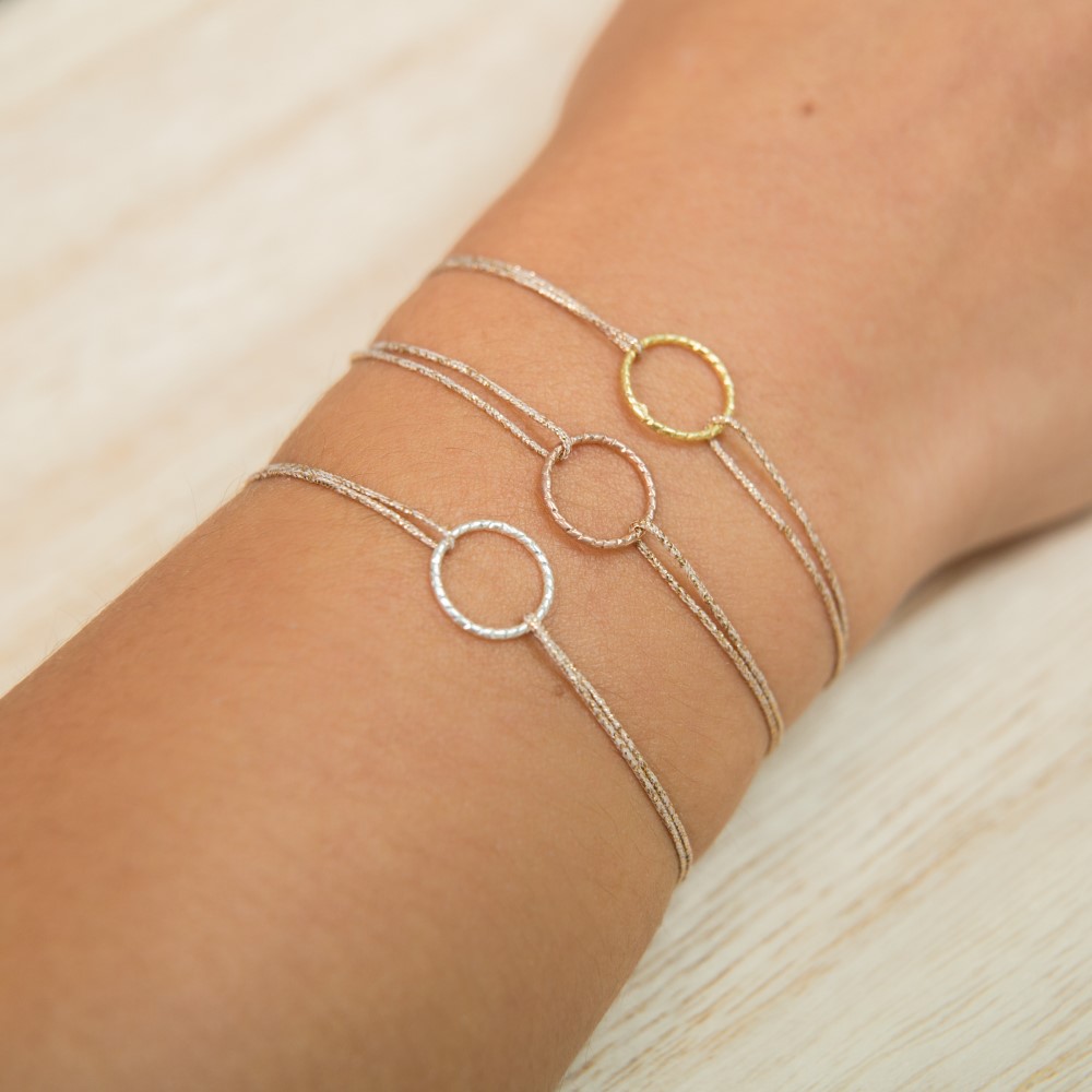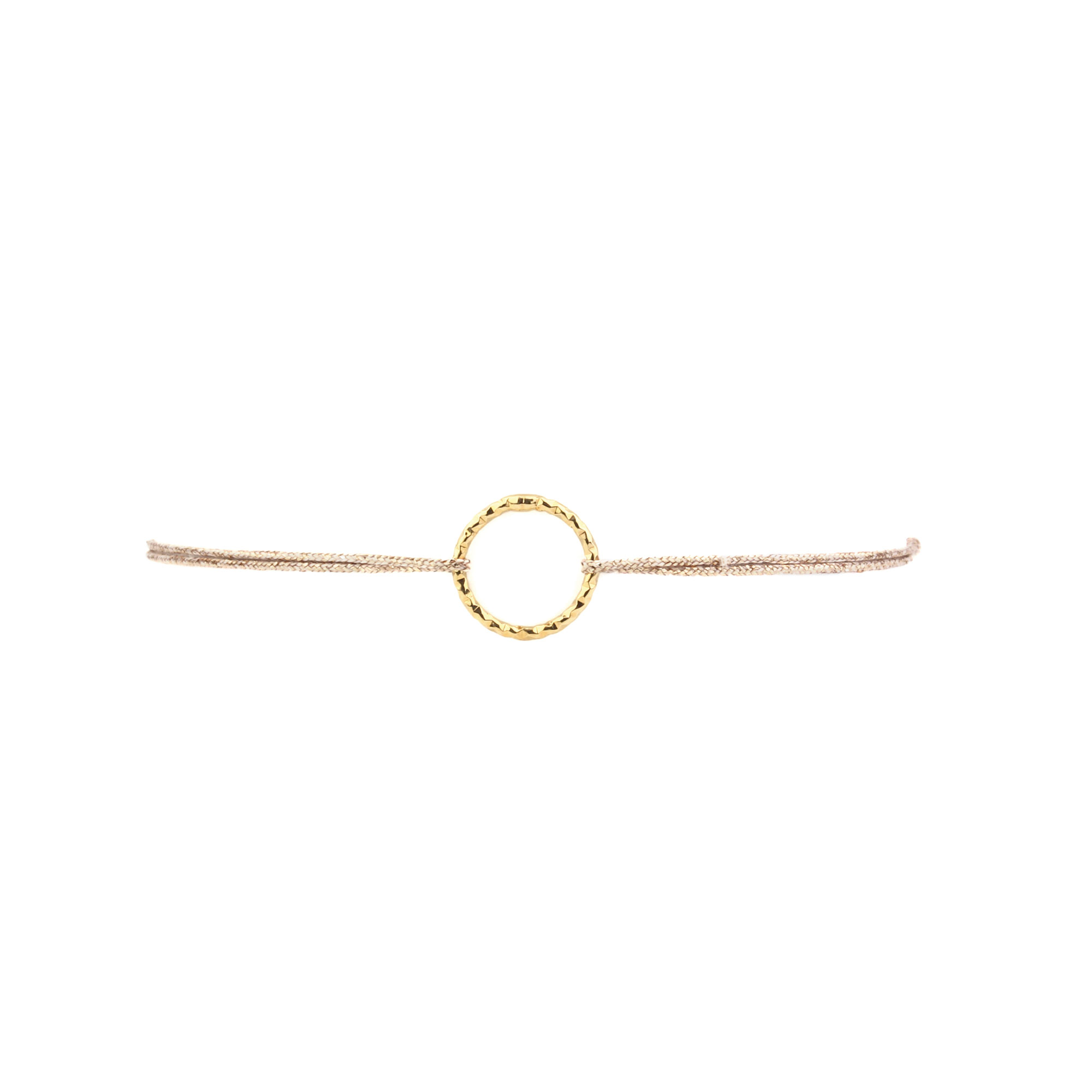 Bracelet cordon composé d'un cercle ciselé plaqué or, fermé avec 2 noeuds coulissants.